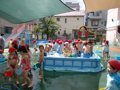 今日は担任も水着着用。子ども達と一緒になって楽しみました。