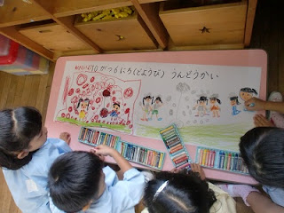年長組は、今日、幼稚園の運動会をお知らせするための「ポスター」を作成しました。