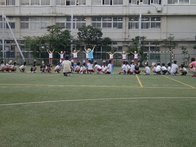 広いグラウンドでは、みんな広がって、歌いながら踊るということを頑張っています。