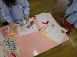 今回の素材はキラキラ光るものばかり。子ども達にはとても魅力的。