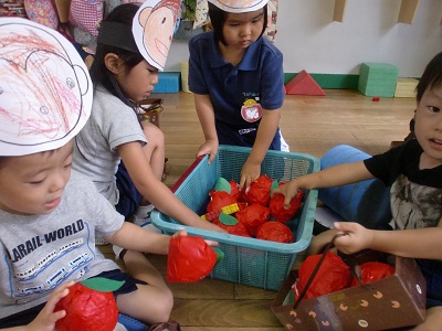 今日は、ひよこぐみの皆のところに「ウッキーくん」が遊びに来てくれました。お腹が空いていたウッキーくんに、先週作った果物をプレゼント。