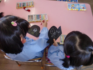きょうは、みんなも海賊に変身して探検しよう!!と海賊の素敵な帽子のお面を作っていましたよ。