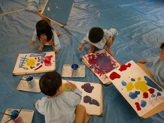 今日も、赤・青・黄色・白の4色の中から自分で1色選び、白い紙に色をつけていきます。1色終わったらまた次の色へ。