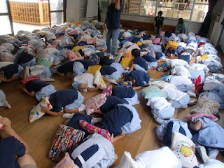 揺れが収まった頃に、防災頭巾を被って避難です。夏休みの間に防災頭巾の被り方を忘れてしまったお子さんもいたようです。お家でも練習してくださいね。
