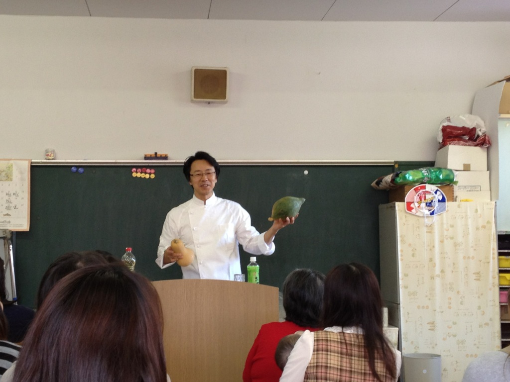 今日は、「れすとらんさいとう」のシェフ、斉藤さんに、幼稚園にお越しいただき、お話をしていただきました。