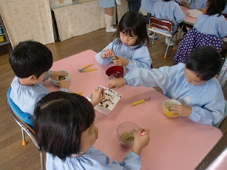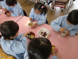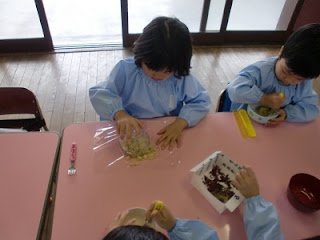 年長組は先日買い物に行って買ってきたさつまいもを使って芋団子つくりをしました。あらかじめふかしておいたお芋の皮をむきます。中には紫色の芋が入っていて、子ども達びっくり!
