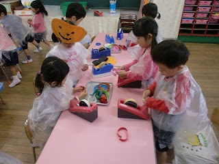 年少組では先日からかぼちゃのお化けのお面を作ってお化けごっこを楽しんでいます。今日はお化けの衣装を作ります。