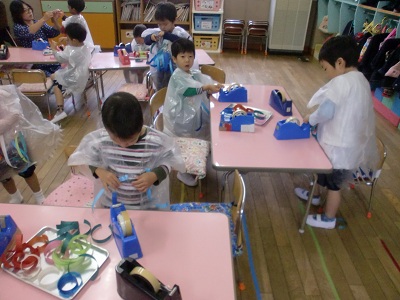 ビニール袋を被って、そこに色々な色の紙テープを貼り付けて、自分だけのお化けの衣装の完成です!ビニールテープの使い方が上手になってきました。