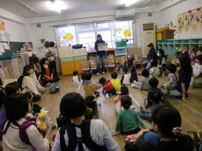 そして、お話の後、保護者の方と一緒に部屋に集まり、踊ったり手遊びをしたり紙芝居を楽しんだりしました。