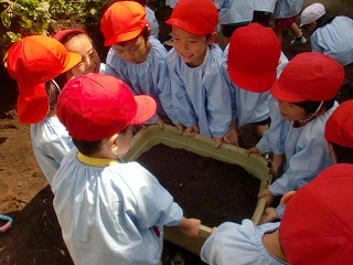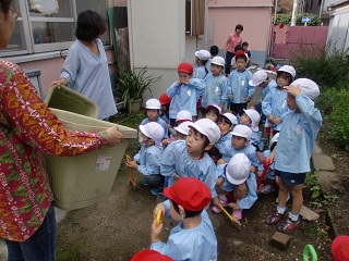 年中組が、栽培に挑戦。大きなプランターに鉢底石を入れてから、土を入れます。