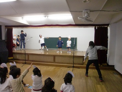 今日は、年中組が遊戯室の舞台を使える日。