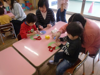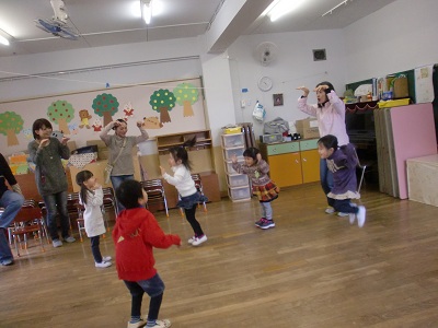 今日は、来年4月から年中組に入る予定のお子さん向けの「おやこ広場」でした。天気も悪かったので、お休みの方が多かったですが、みんなにこにこで来てくれました。