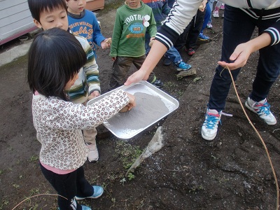 切り口に灰をつけて、土の中に埋めていきます。