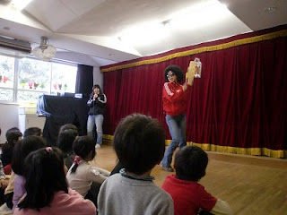 今日年長組のところに、以前にも遊びに来た「しゃぼんだマイケル」さんがやってきました。手にはなにやら持っています。空き箱などで作った楽器だそうです。