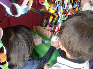 部屋の中の作品は、先週の2日でみんなで遊ぶ時間を削って作ったものです。でも、作ったもので遊ぶ時間が全くなかったので、今日は部屋の中で楽しそうに遊んでいました。