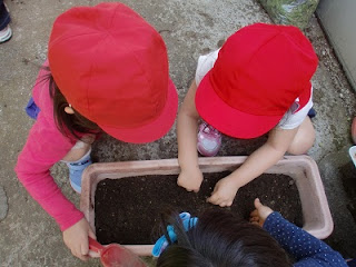 さてこちらは、昨年とれた「あさがおのたね」を蒔く準備。