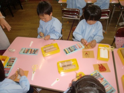 あんぱんまんやカレーパンマン、チーズなどの中から2つ選び、色を塗ったり身体になるトイレットペーパーの芯につけたり。