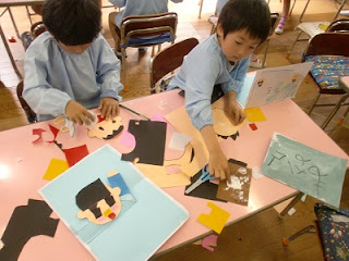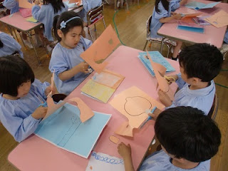 実は先日1回目として、表紙を作っていましたが、今日はマリーさんという仕掛け絵本やカードを作っている方に来ていただき、子ども達も飛び出すカードに挑戦。