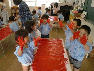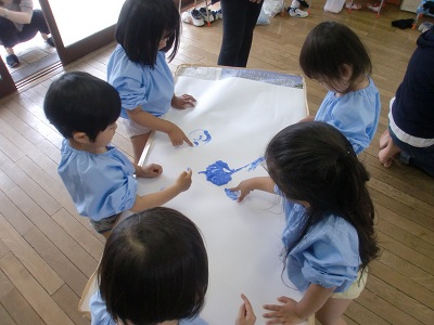 ひよこぐみは、今日はフィンガーペインティング。まず着替えをし、机に貼ってある白い紙の感触を楽しんでから、ゆび絵の具の感触を楽しみました。恐る恐る触る子・感触が苦手で早めに切り上げてしまう子もいましたが、感触・色が混ざって変わっていく様子を楽しむ子もいました。