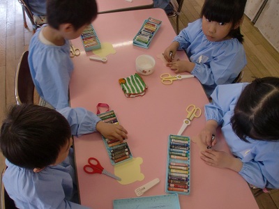 年中組さん、先生の話を聞いていますね。今日は制作をするようです。