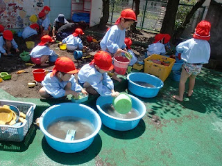 たらいに入っている水を、バケツなどで砂場に入れて、川を作ったりお料理をしたり。