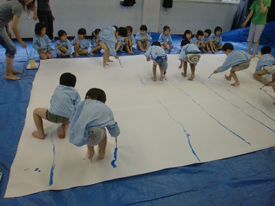 一人ひとり筆を持ち、紙の端から端まで線をひきました。