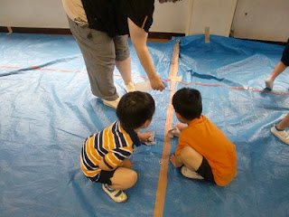 先生やおかあさん先生が「魔法の水(霧吹きです)」をかけてくれたところを、雑巾で拭いてきれいにしました。