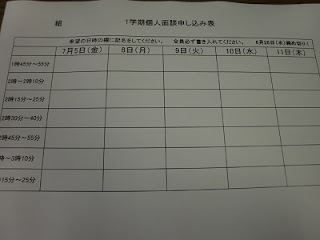 7/5~11の間のご都合の良い時間帯に幼稚園にいらしていただきたいと思います。写真の様な表を来週月曜日から幼稚園の玄関に置いておきますので、ご都合の良い日時の所に記名をして下さい。