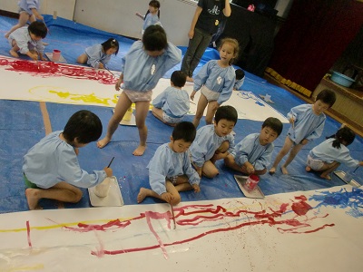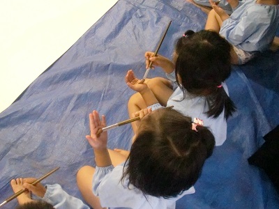 今日はたんぽぽぐみの絵の具遊びの日。着替えをして遊戯室に行くと、一面ビニールシートの上に大きい白い紙が。