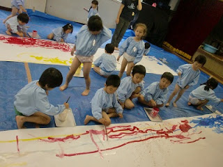 今回も赤・青・黄色・白の4色の絵の具で線を描いたり・・・
