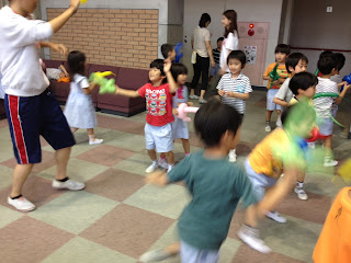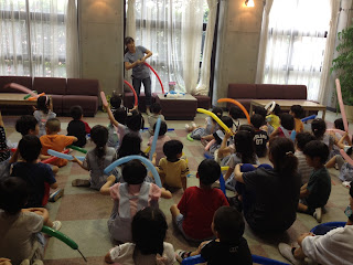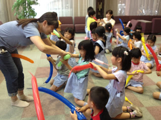 年長組は今日のにこにこタイムの時間にバルーンアートを教えてもらいました。最初に動物などを作っていただきました。そして、子ども達も挑戦。細長い風船をねじる ということにドキドキしていた子もいましたが、頑張っていました。