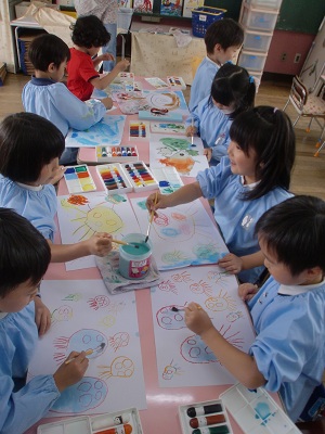 今まで絵の具を楽しんできた子ども達。色もどんどん自分で作って塗っている頼もしい姿でした。