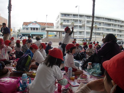 館内には他にも沢山お客さんがいたので、一度外に出て、屋根のあるところでお弁当。「トンビが来て、お弁当を持って行ってしまうことがあるから、気を付けよう」と話をしていましたが、M先生の持っていたサンドイッチがトンビに取られてしまうという大事件も!!