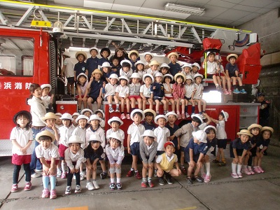 消防署のお兄さんやお姉さんとご挨拶した後は、写真(消防の洋服も着せてもらいました)&質問をほしぐみ、消防車を見せてもらったり乗せてもらったりのゆきぐみ。終わったら、交代しました。