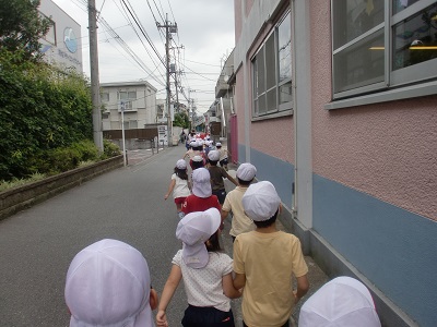 今日は、年長組でお出かけ。みんなで手をつないで出発していきました。