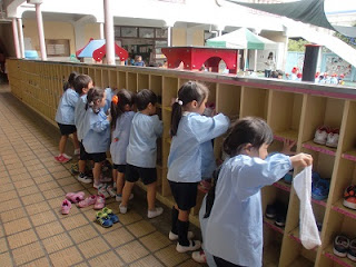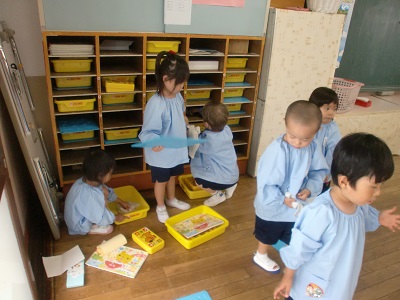 今日は、大掃除の日です。幼稚園では一学期に一回、みんなで使った部屋や道具箱、靴箱などを掃除しています。
