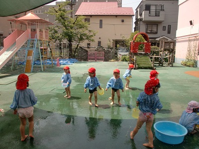 年少組は、身体測定の後に、年中組は体操教室の終了後に水遊び。
