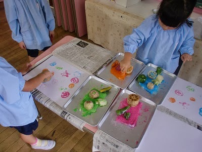 年中組は各自でお家から持って来てもらった「野菜」でスタンプ遊びをしました。お家でどんな野菜にするか、相談したようですね。