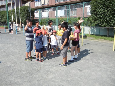 「何して遊ぶ?」「ドッジボールやろうか」優しくしてもらって、年長組もとても楽しそうでした。