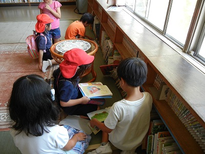 図工室や家庭科室を外から見ました。図書室では靴を脱いで本を読むスペースもありました。