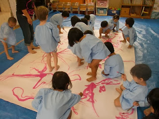 ひよこぐみは今日、絵の具遊びを行ないました。