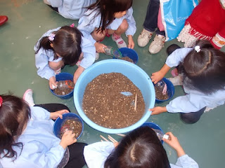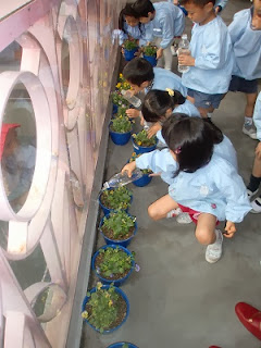 今日は、お花の専門家の、安田先生・綱島先生・財団法人 日本花普及センターの星さんが来て、年長さんの「お花を育てる」活動にお手伝いいただきました。