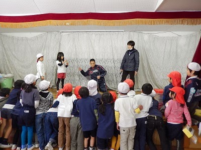 午後、遊戯室に子ども達が集まっています。その視線の先には、体操教室のささき先生や年長組のお友達。