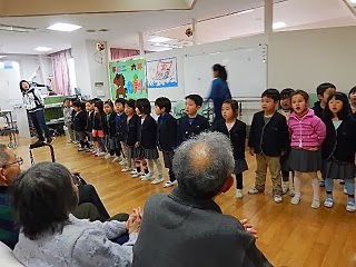 木曜日は、小雨が降っていましたが、子どもたちは元気に歩いて行きました(上の写真は金曜日、さくらぐみのものです)。年中組がケアプラザに行くのは初めてです。みんなでおじいちゃまやおばあちゃまの前でどんなことをしたら喜んでもらえるか、相談してから行きました。