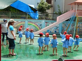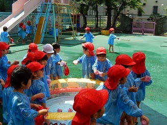年少組は今日水遊びをしました。
