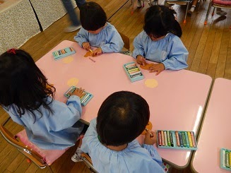 年少組は、先日の遠足の後に「大型バス」を作りました。