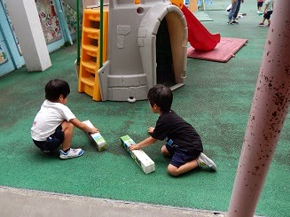 牛乳パックをつなげ、タイヤや窓をつけただけですが、子ども達は電車に見立て、想像を膨らませながら遊ぶことができます。この時期に「見立てる」経験を重ね、色々な事をイメージする力をつけてほしいなと思っています。