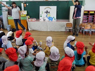 今日は、年少組さんは「♪しゃぼんだま とばせ」の歌を教えてもらいました。