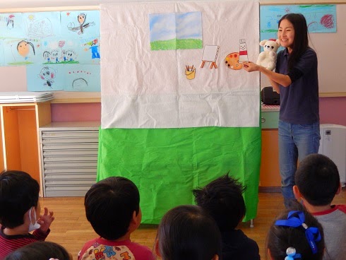 今日は、年中組のたんぽぽ・さくら それぞれの部屋で、新しいお話を教えてもらいました。
