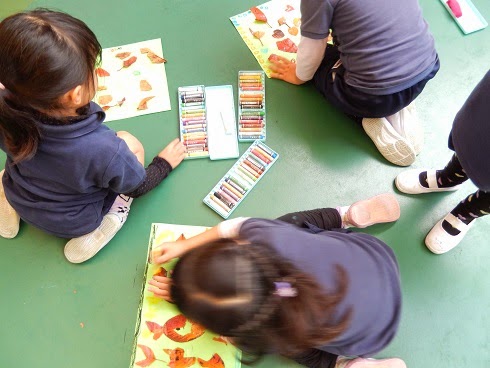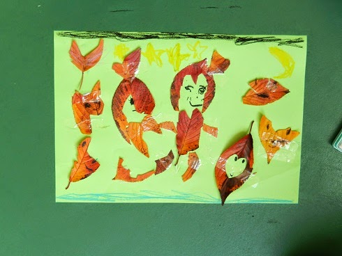月曜日、庭の桜の葉が沢山落ちていたので、それを使って制作をしている子がいました。